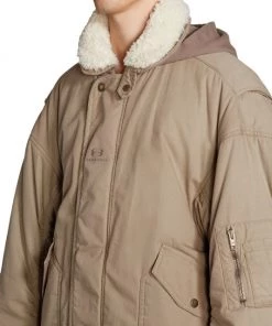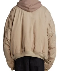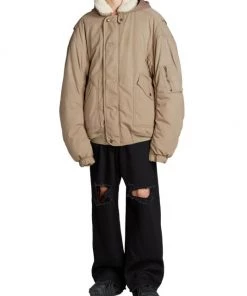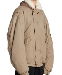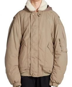 In an absurdist exploration of the line between fashion and entertainment, Balenciaga’s Creative Director Demna juxtaposes boastful glamour with a dystopian edge. Oversized gowns, sequin column dresses, boas, and sleek pleats meet a Y2K, cyber-goth approach to tailoring, baggy denim, and layered knits. This utilitarian-style bomber jacket features a sherpa collar and a hood.