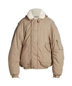 In an absurdist exploration of the line between fashion and entertainment, Balenciaga’s Creative Director Demna juxtaposes boastful glamour with a dystopian edge. Oversized gowns, sequin column dresses, boas, and sleek pleats meet a Y2K, cyber-goth approach to tailoring, baggy denim, and layered knits. This utilitarian-style bomber jacket features a sherpa collar and a hood.