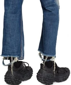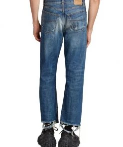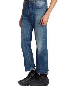 In an absurdist exploration of the line between fashion and entertainment, Balenciaga’s Creative Director Demna juxtaposes boastful glamour with a dystopian edge. Oversized gowns, sequin column dresses, boas, and sleek pleats meet a Y2K, cyber-goth approach to tailoring, baggy denim, and layered knits. In a five-pocket silhouette, these slim-fit jeans feature distressed hems.