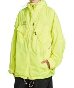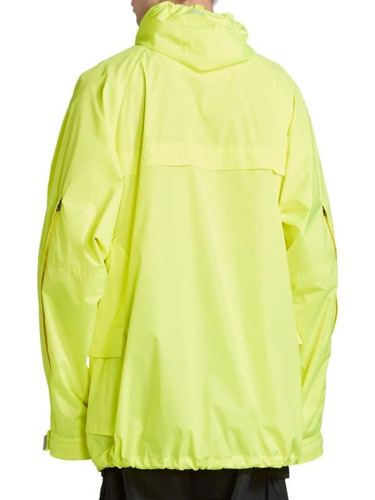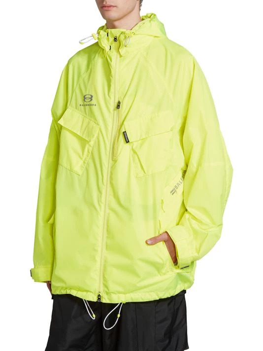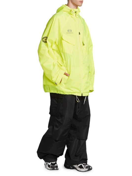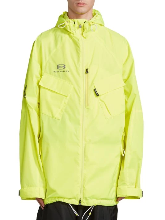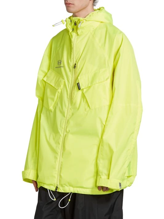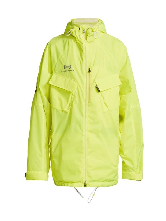 Balenciaga takes on a cyber-glam aesthetic, working lavish details like sequins and boas into baggy, oversized garments. Perfected by Creative Director Demna Gvasalia, this collection encompasses over-the-top platforms, pleated dresses, and strappy studded jeans. This polyester parka features a drawstring hood and flap pockets on the chest and at the sides.