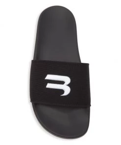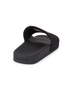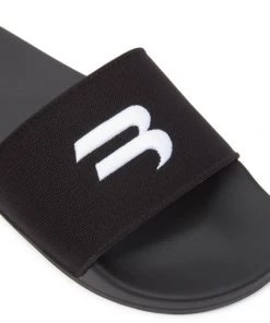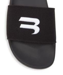 A textured upper featuring an embroidered logo design enhances these Balenciaga pool slides.