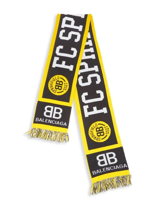 French fashion house Balenciaga joined forces with animated sitcom The Simpsons™ & © 20th Television for a light-hearted collection of graphic T-shirts, oversized sweatshirts, baseball hats, and wristlet wallets. Creative Director Demna Gvasalia, a lifelong fan of the series, created a signature image for the line that features Homer, Marge, and their family, outfitted in iconic looks from the label’s past. Finished with a fringed hem, this scarf features Springfield lettering, in reference to the town where the iconic show The Simpsons™ takes place.