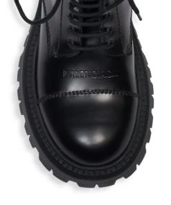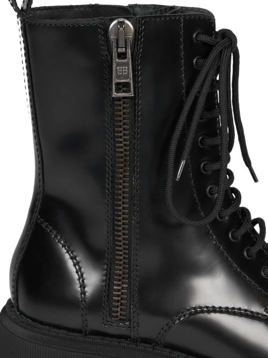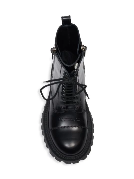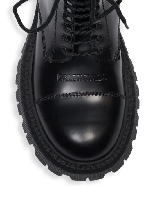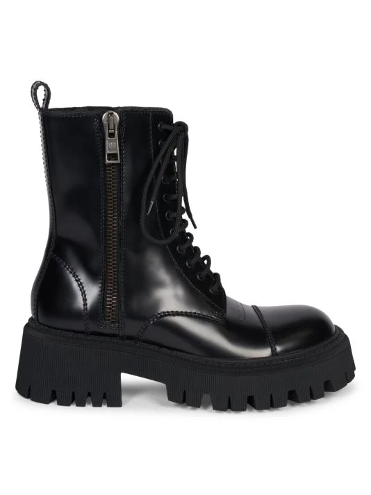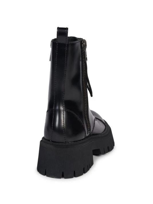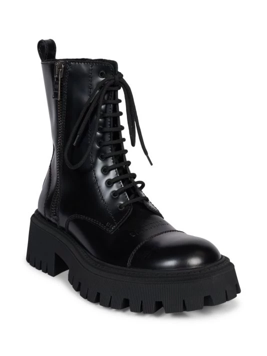 Chunky leather combat boots with a lug sole and embossed logo at the vamp.