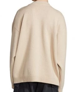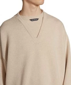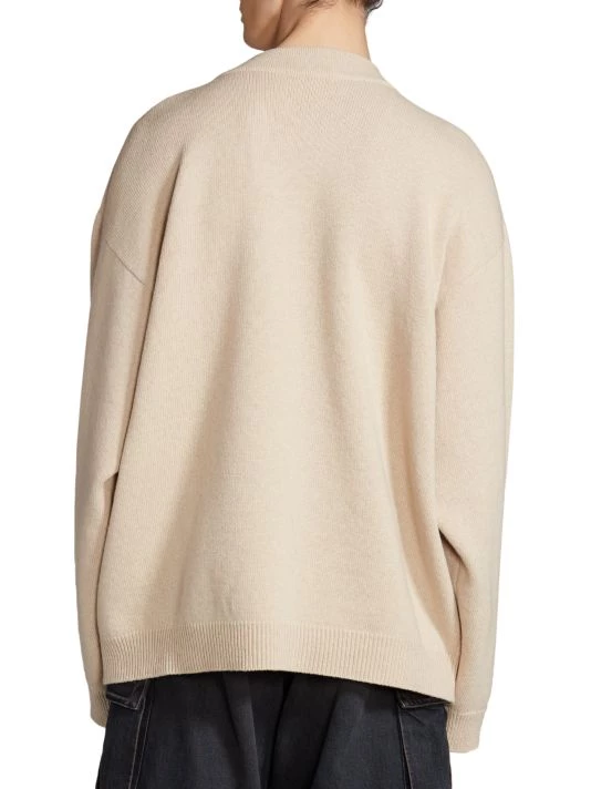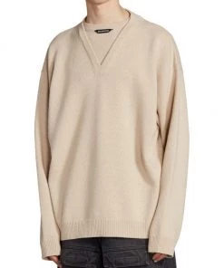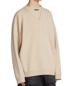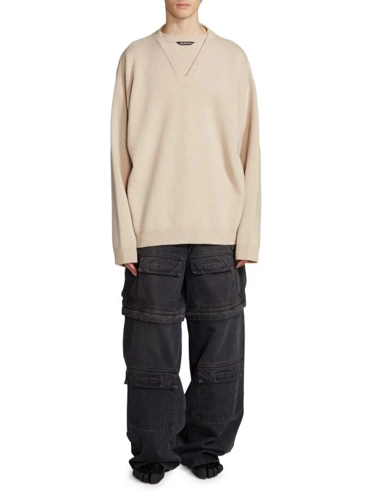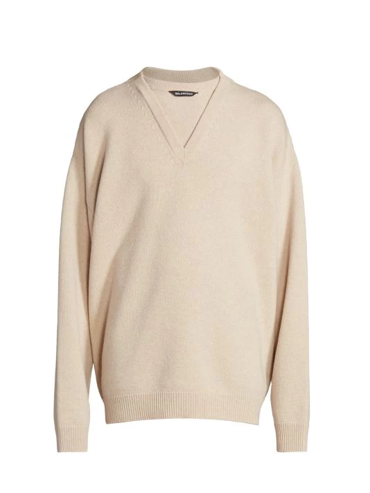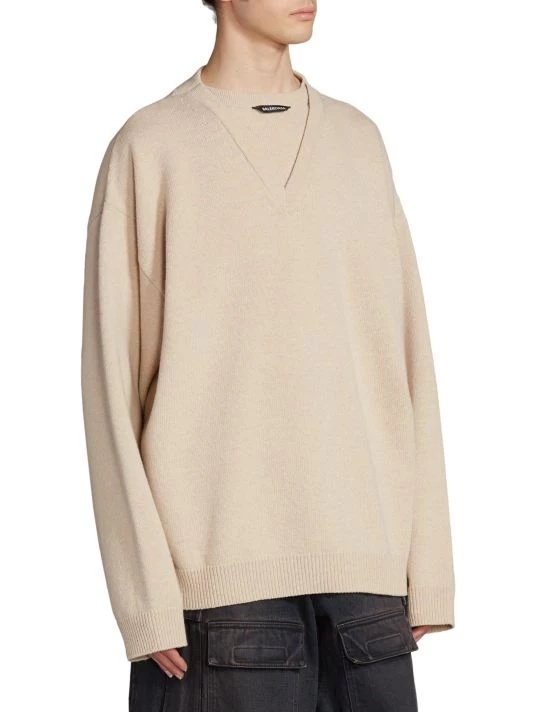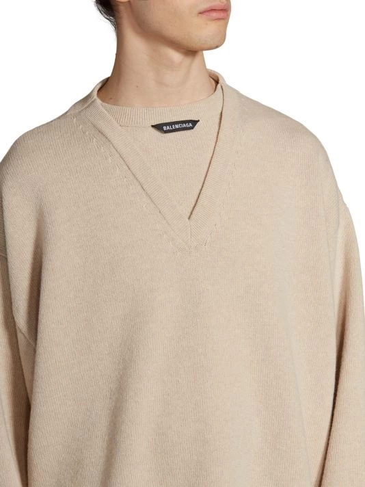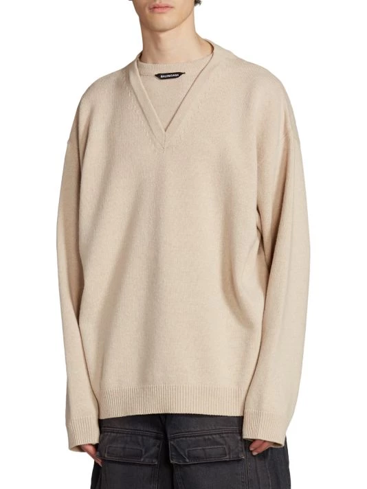 This pull-over sweater features a v-neck and long sleeves with ribbed cuffs.