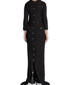 Fastened by decorative logo-embossed buttons at the back, Balenciaga’s midi dress is crafted of tweed fabric. This Italian-made piece is finished with a flattering back leg slit.