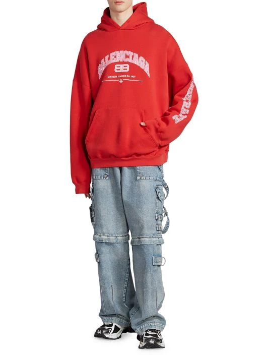 Balenciaga takes on a cyber-glam aesthetic, working lavish details like sequins and boas into baggy, oversized garments. Perfected by Creative Director Demna Gvasalia, this collection encompasses over-the-top platforms, pleated dresses, and strappy studded jeans. In a nostalgic aesthetic, this classic hooded sweatshirt features the brand’s logo in a varsity style across the chest.