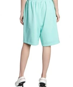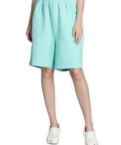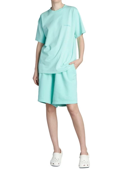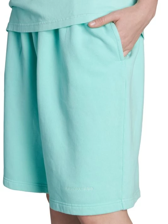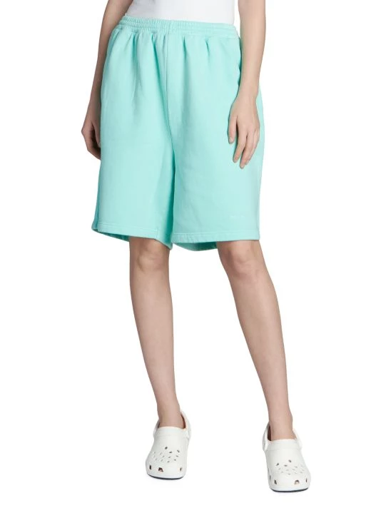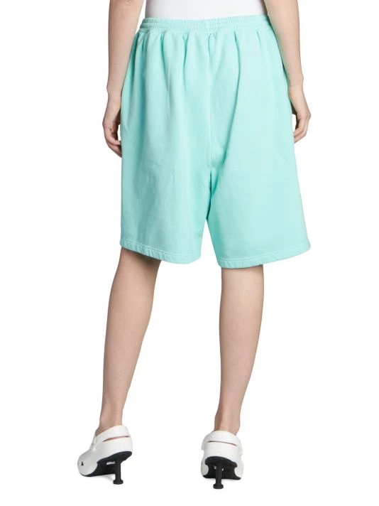 Balenciaga takes on a cyber-glam aesthetic, working lavish details like sequins and boas into baggy, oversized garments. Perfected by Creative Director Demna Gvasalia, this collection encompasses over-the-top platforms, pleated dresses, and strappy studded jeans. Pleated wide-leg sweat shorts with a comfort elasticized waist.