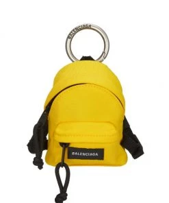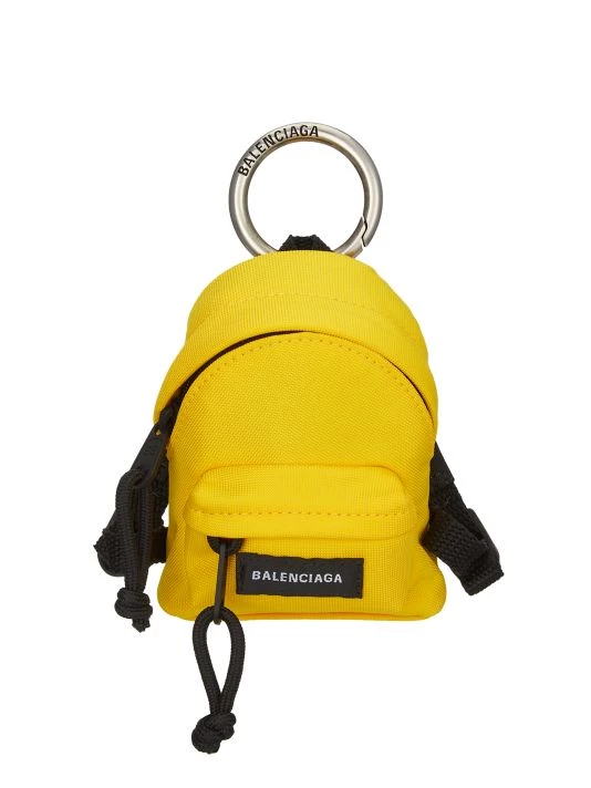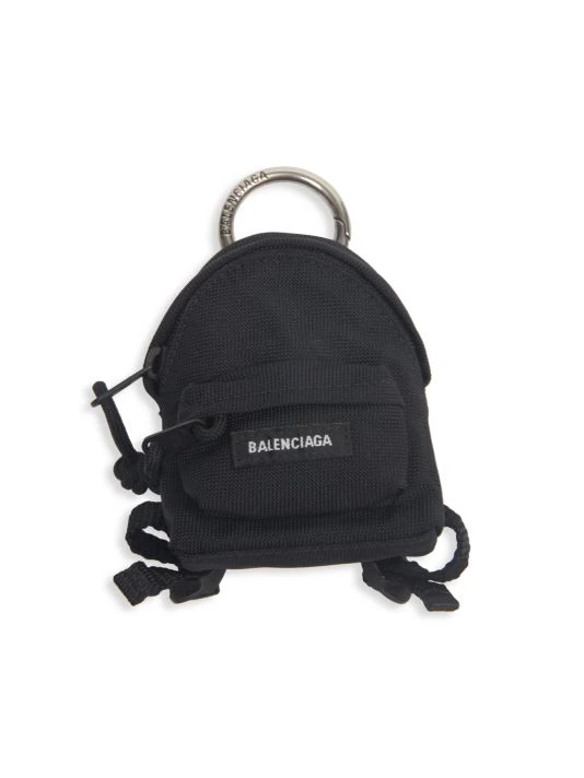 Balenciaga’s micro backpack features a woven exterior with a contrast logo label and an engraved silvertone metal top handle.