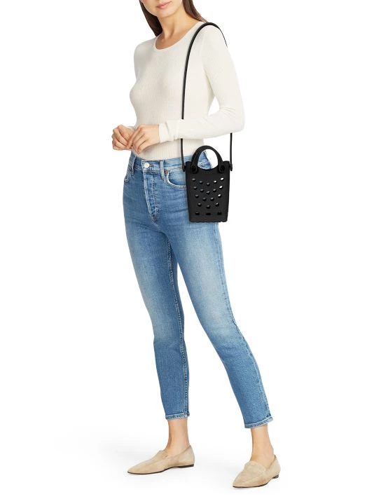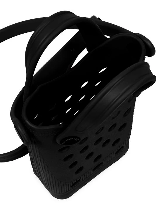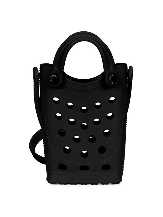 From the Balenciaga x Crocs™ Collaboration. Designed to resemble the iconic shoe, this phone holder is detailed with signature logo hardware. Handles and an adjustable strap accompany this Italian-made piece for hands-free ease.