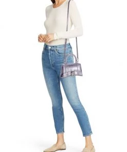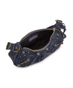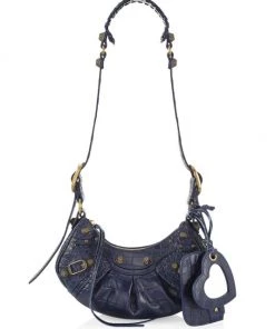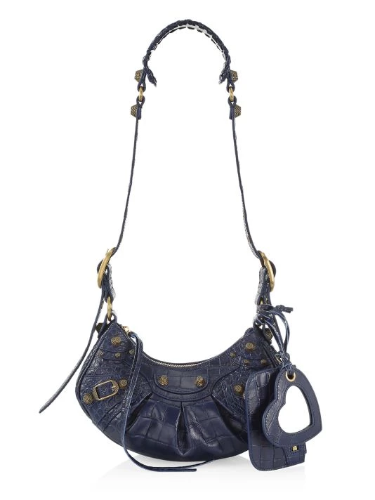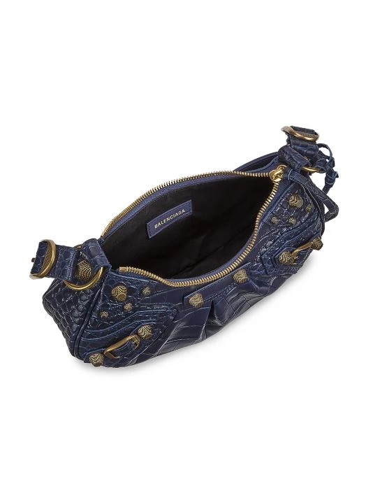 From the Le Cagole Collection. Made in Italy of crocodile embossed leather, Balenciaga’s shoulder bag features long knotted zipper pulls and signature studs. This luxurious piece is accompanied by a zip pouch and a heart-shaped compact mirror.