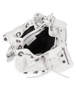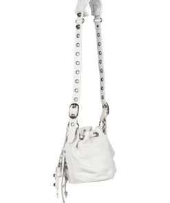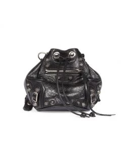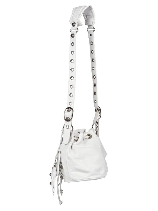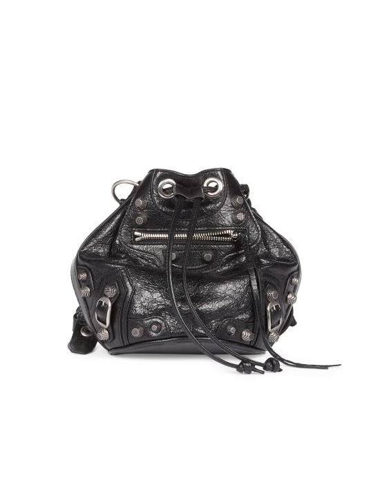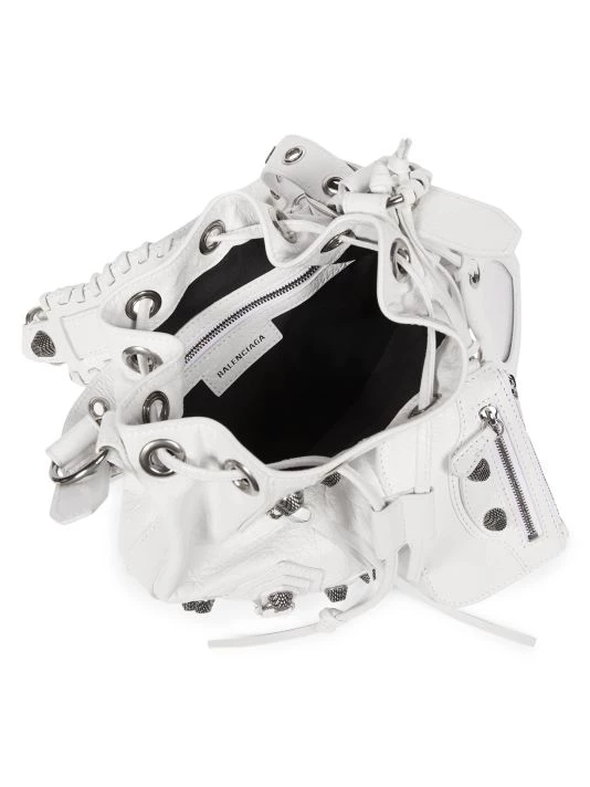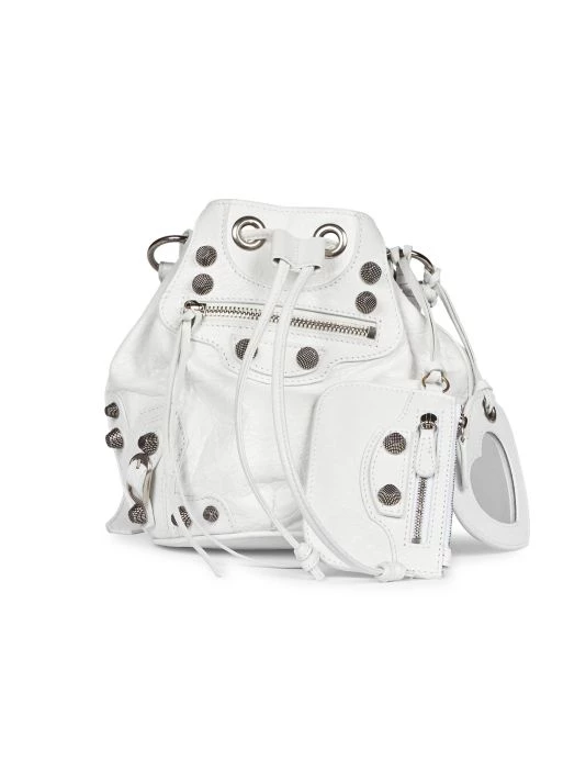 Made in Italy of crinkled leather with a glossed finish, Balenciaga’s Le Cagole bucket bag features instantly recognizable long knotted zipper pulls and signature studs. This luxurious piece is accompanied by a zip pouch and a heart-shaped compact mirror.